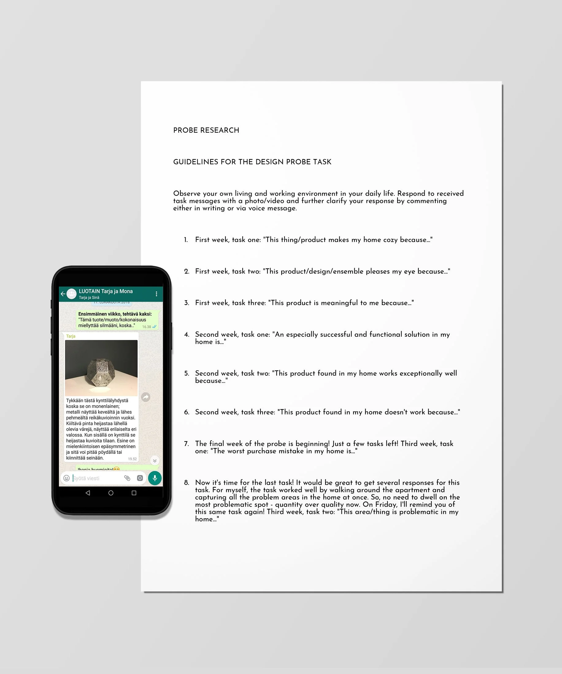 For the in-depth interviews and probe research, I successfully recruited 8 participants. During the interviews, we meticulously mapped out the purchasing behavior and preferences of our users. Towards the end of each interview session, we further refined our approach for the subsequent probe research. In this research, participants observed their own daily living and working environments. Leveraging platforms like WhatsApp, I assigned observation tasks, and participants responded with a variety of media, including pictures, videos, text, and voice messages.