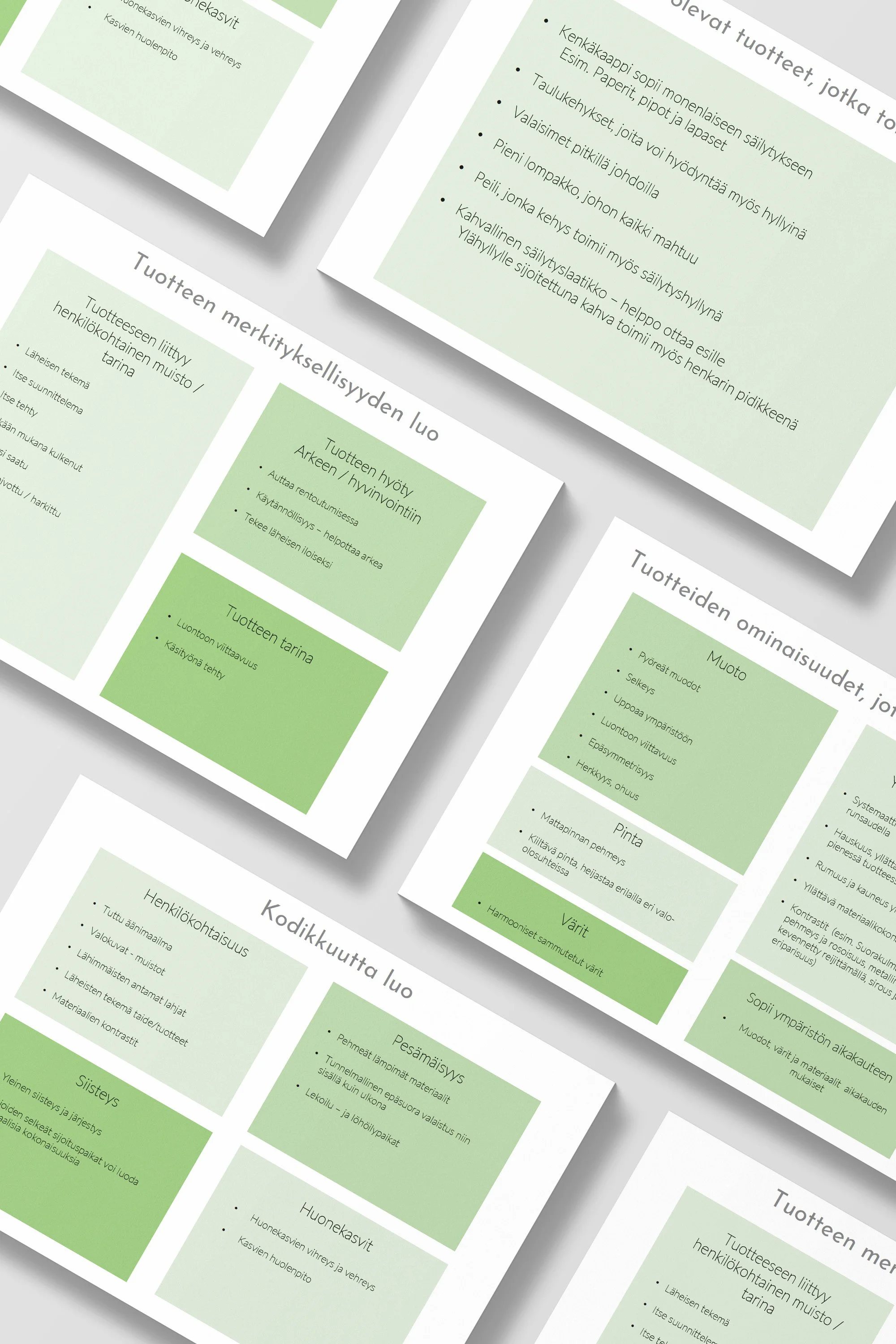 During desk research, I came across the “Miten Suomi sisustaa” study (in English, “How Finland decorates”) by Vepsäläinen, which extensively examined Finnish decorators and defined user groups. I utilized this research for defining targeted customer groups for the company. I identified the primary customer group as the "Sustainably Responsible" group, constituting 21% of Finnish decorators. Secondary customer groups were defined as "Towards the Dream Home" (22% of Finnish decorators) and "Discovering Individuality" (20% of Finnish decorators). Based on these customer groups, I determined how the company aims to meet their needs.